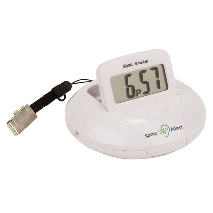 The Sonic Shaker is a digital vibrating travel alarm clock. The clock is very easy to set and use with vibrate only, beep only or vibrate with beep modes.