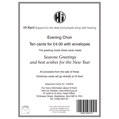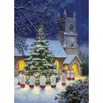 A beautiful snowy scene of carol singers around the Christmas tree, with the light from the church windows shining around.