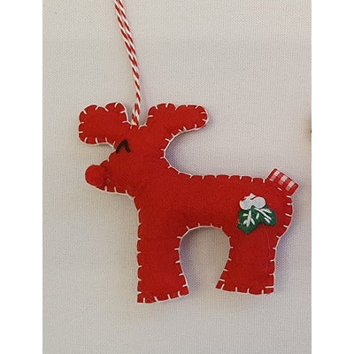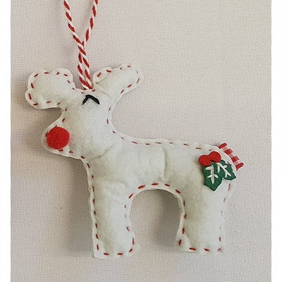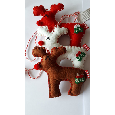 These hand sewn reindeer are decorated with holly or mistletoe and have matching hanging loops. Lovely in a group of different colours.