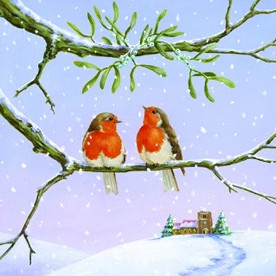 Two robins sitting on a snowy branch in a gentle wintery scene. One of them notices the mistletoe above...