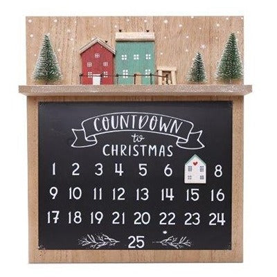 This rustic Advent count down is painted on a chalkboard, with a little magnetic house to move along the numbers towards the big day... It features a rustic wooden Christmas village scene, decorated with snow tipped trees and a mini log pile.