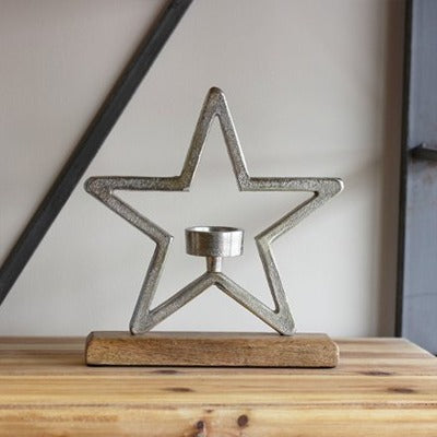 A chunky aluminium star outline stood on a wooden base with a T-light centred inside.