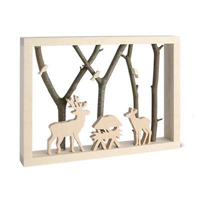 Exquisite wood work depicting deer in the forest investigating the contents of the manger, with tiny birds in the trees watching over them.